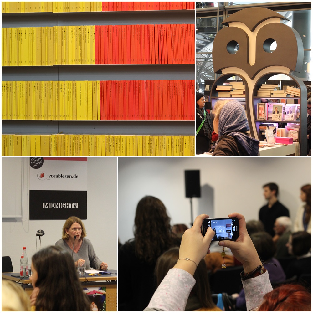 | im Uhrzeigersinn: Reclam – die Ullstein-Eule, leider ist mir immer jmd. durchs Bild gelatscht – Corina Bomann bei der Lesung (2 Bilder) |