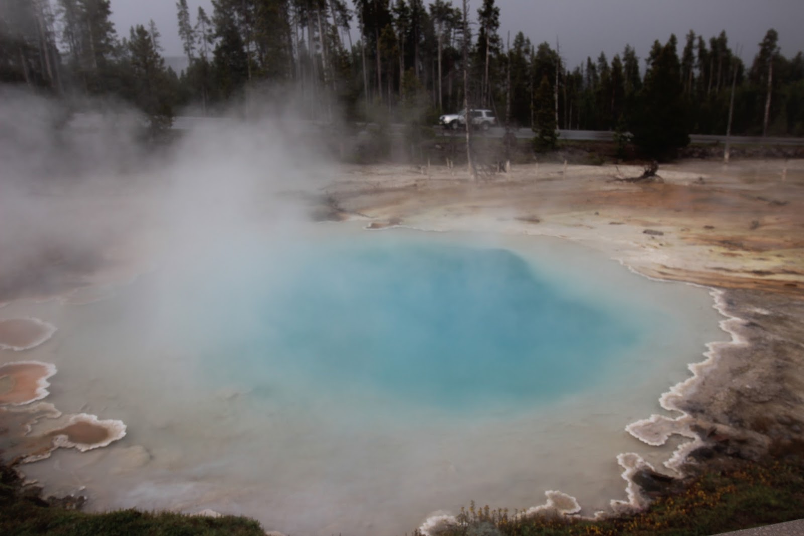 Nach einem Zwischenstopp bei Walmart, der Rebecca und mich mindestens so fasziniert hat wie ein Museum (wo in Europa findet man schon Cheeseballs – eine Art Chips – in einem 50 cm hohen, durchsichtigen Plastikbehälter?), sind wir nach 9:00 Uhr los in den Nationalpark. Für diese Wegstrecke durfte/musste Rebecca zun ersten Mal ans Steuer. Im Nationalpark habe ich das Fahren übernommen und wir sind noch einmal ewig gefahren, um zu dem Geysir „Old Faithful“ zu gelangen. Das Wetter war sehr wechselhaft und leider hat es in Strömen geregnet, als wir auf den Ausbruch des Geysirs gewartet haben. Ich war unendlich froh, meinen Schirm dabei zu haben. Es war etwas bizarr, mit einer Horde weiterer Besucher im Kreis zu stehen und auf den Ausbruch zu warten. Allgemein war heute sehr viel mehr los als gestern, was vermutlich an dem langen Feiertagswochenende gelegen hat. Auf dem Weg zu „Old Faithful“ haben wir auf der Gegenfahrbahn bereits einen kilometerlangen Stau gesehen und mir schwante Böses… Der Geysirausbruch selbst war beeindruckend, aber auch im Vergleich zu dem Aufwand, den wir betrieben haben, um dort hinzugelangen, schnell vorbei. Das fand ich am heutigen Tag insgesamt nicht so toll: das Verhältnis zwischen betriebenem Einsatz und Output hat für mich nicht gestimmt. Wir saßen ewig im Auto (und ich auch echt lang am Steuer), haben aber kaum etwas außerhalb des Autos unternommen: nach dem Geysirausbruch saßen wir bei Hagel eine Weile in der urigen angrenzenden Lodge fest. Danach sind wir einen kurzen Rundgang mit weiteren Geysiren und heißen Pots etc. abgelaufen und haben eines dieser bunten Löcher (thermale Pools) angeschaut, wobei wir Rebeccas Liebling, den „Morning Glory Pool“, nicht gefunden haben. Das war’s. Und das ist für mich kein Naturerlebnis. Natur pur ist für mich, wenn ich zum Wandern von Seis aus mit der Bahn auf die Seiser Alm fahre und dort den ganzen Tag zu Fuß verbringe.