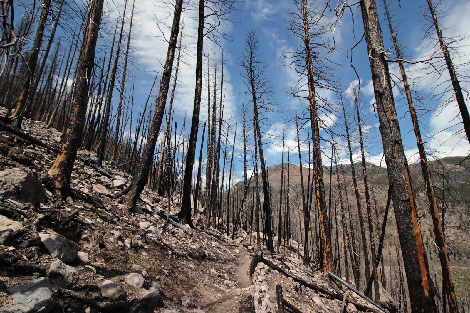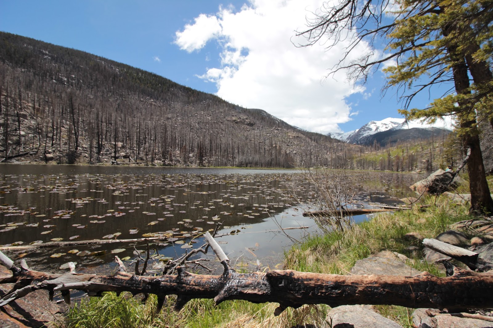 Anschließend sind wir direkt in den Rocky Mountains Nationalpark und haben am Holliwell Trailhead geparkt. Von dort aus sind wir bei strahlendem Sonnenschein Richtung Cub Lake gewandert. Das war die meines Erachtens schönste Wanderung, die wir gemacht haben. Zu Beginn ging es stetig bergan, später erfolgte der Abstieg zum Cub Lake. Hierbei ging es auch über drei oder vier Schneefelder, die ich wieder als anstrengend und scary empfunden habe. Der sulzige Frühjahrsschnee bricht schnell ein und man versinkt beinahe bis zum Knie darin. Und neben einem geht es steil in den Abgrund. Alles ein bisschen wilder hier als in den Alpen. Wir haben ziemlich viele geschädigte Bäume gesehen, denn hier hat der Borkenkäfer gewütet. Außerdem gabe es 2012 am Cub Lake einen Waldbrand und dort stehen und liegen jetzt verkohlte Bäume. Sowohl den Borkenkäfer als auch Waldbrände betrachtet man hier als natürlichen Vorgang, der zum Kreislauf des Waldlebens dazugehört. Ein interessanter Ansatz, den mein Vater als privater Waldbesitzer vermutlich nicht teilt. Trotz Erkältung und Höhenluft bin ich mit meiner Kondition recht zufrieden. Wenn ich daran denke, wie ich vor ziemlich genau 10 Jahren am Comer See einen Berg hoch geschnauft bin… Der Cub Lake liegt sehr idyllisch und wird von Seerosen bewachsen. Mit den schneebedeckten Bergen im Hintergrund eine Traumkulisse. Da es kein Rundwanderweg war, ging es nach einer kurzen Rast wieder auf den gleichen Pfaden zurück zum Parkplatz.