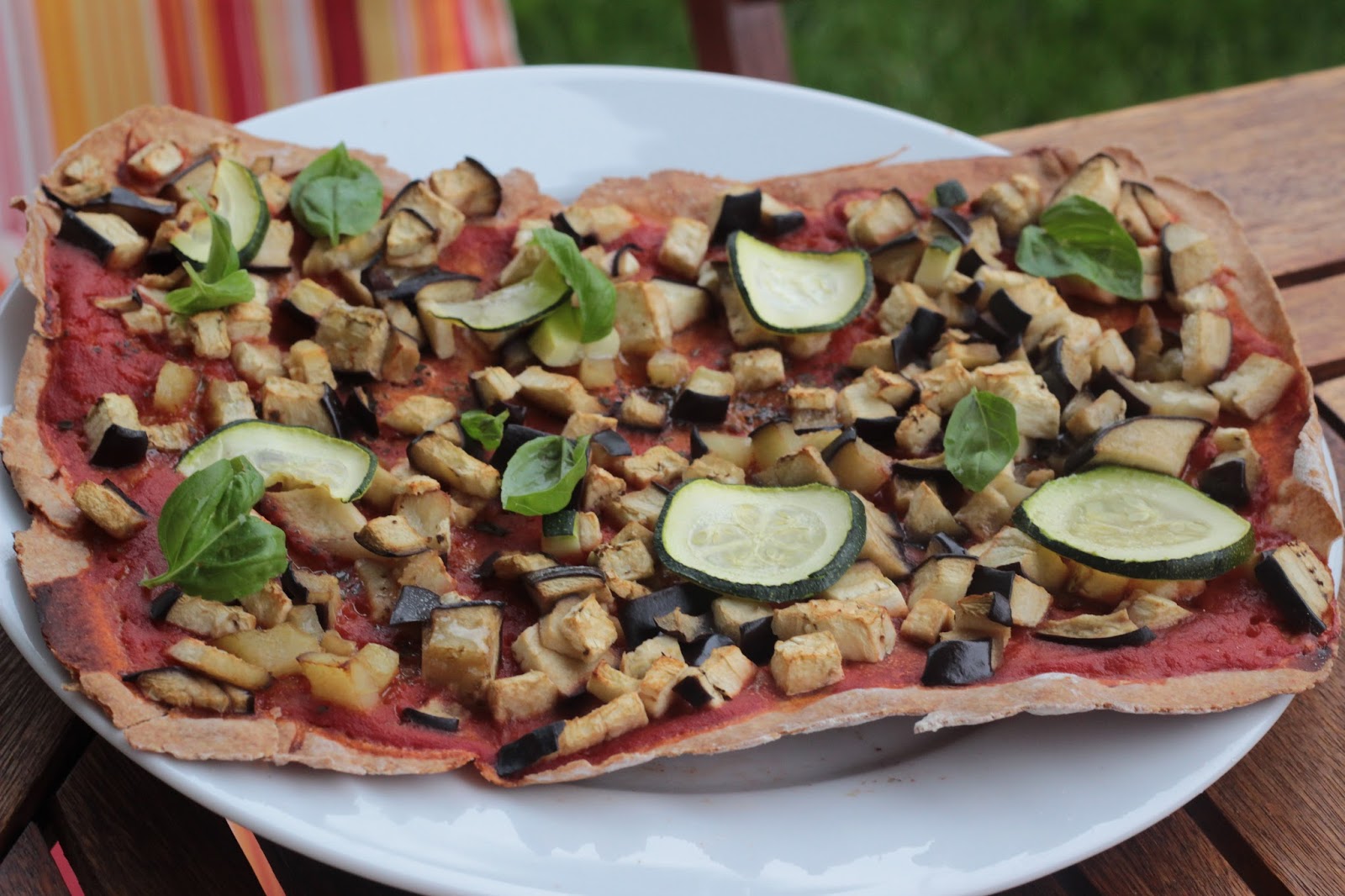 Den fertigen Teig noch einmal durchkneten, gegebenenfalls ein bisschen Mehl hinzufügren, damit er nicht zu pappig ist. Ich teile den Teig meist in zwei Hälften. Die eine Hälfte packe ich in eine Tupperschüssel in den Kühlschrank für den nächsten Tag. Die andere Hälfte teile ich in vier gleiche Kugeln und welle vier dünne Pizzafladen aus. Das reicht für zwei Personen. Darauf verstreiche ich die passierten Tomaten und würze mit Salz und Basilikum. Danach mit dem klein geschnittenen Gemüse belegen, noch einmal würzen und mit Olivenöl beträufeln.