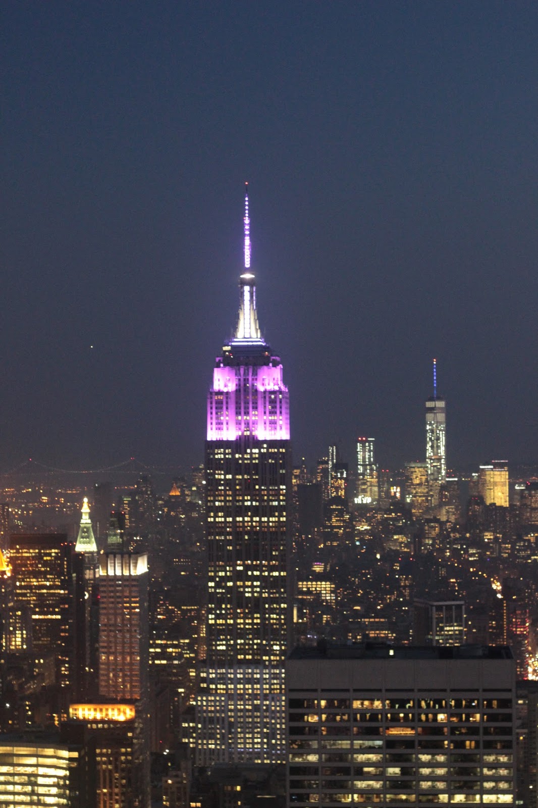 Auf dem Rückweg haben wir die Chance genutzt, auf Top of the Rocks zu fahren. D.h. wir mussten uns unter Anleitung von super perky Anweisern in diverse Schlangen einreihen („side by side“, „2 and 2“), um auf die Aussichtsplattformen des Rockefeller Center zu gelangen. Der Anblick der beleuchteten Stadt in der Dämmerung hat dafür entschädigt. Vor allem das lila/pink angestrahlte Empire State Building war toll.